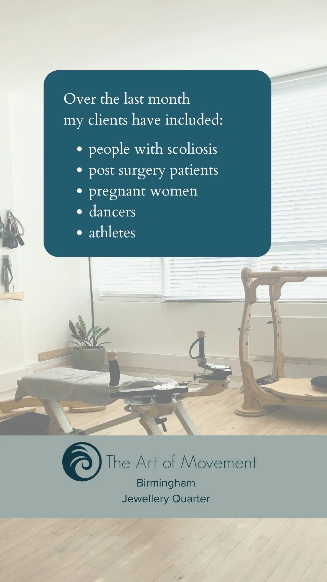 In the heart of the Jewellery Quarter the studio is a light, airy and welcoming space in which to spend time on yourself. We aim to develop long term relationships with clients to help them achieve their health and fitness goals, & offer 1-to-1, duet and virtual classes to suit different budgets